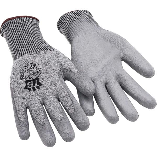 Fibra HPPE + fibra de vidrio gris sin costuras. Recubrimiento poliuretano gris en palma. Galga 13.