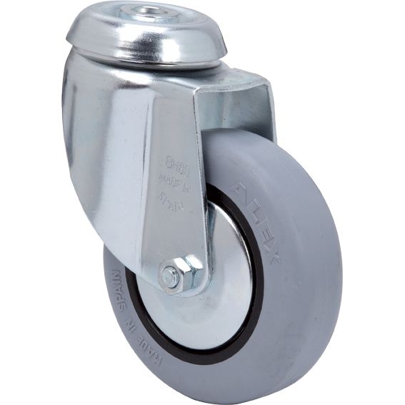 Soporte con doble rodamiento a bolas. Bandaje de goma gris inyectado sobre núcleo de poliamix. Cojinete liso. Rueda ø 80 mm. Carga 60 kg. EN 12528/12530. Soporte. Sin freno.