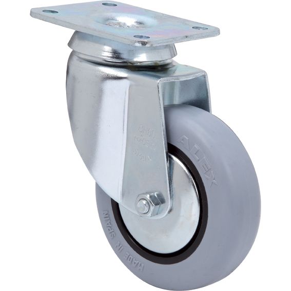 Soporte con doble rodamiento a bolas. Bandaje de goma gris inyectado sobre núcleo de poliamix. Cojinete liso. Rueda ø 80 mm. Carga 60 kg. EN 12528/12530. Pletina. Sin freno.