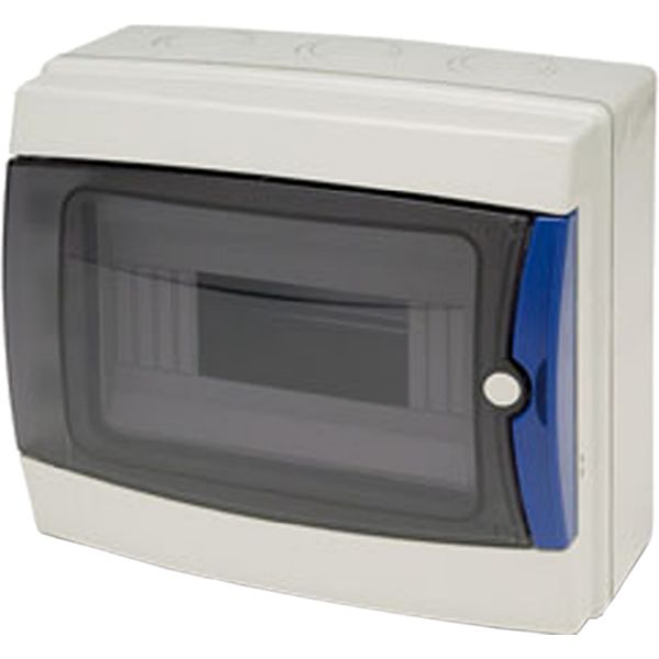 Estanco, aislante, libre de halógenos. IP65. Puerta transparente, carril DIN. 8 elementos.
